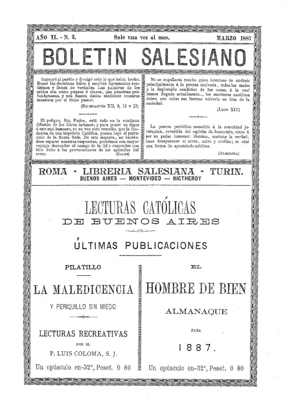Inspecta insuper pretii tenuitate, eerte hrnc editio omnium eommodissima erit. Qul illam igitur sibi comparare voluerit litteras mittat una cum pretio inferius adjecto. --In Italia: A la Librería Salesiana, Calle