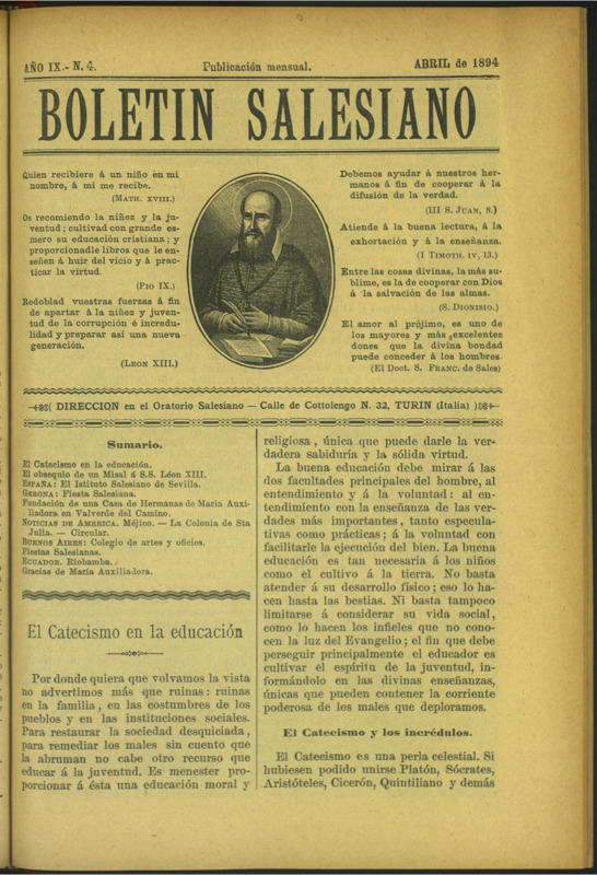 Con aprobación de la Autoridad Kclesiistica - Gerente JOSÉ QAMBINO. - Turin, 1894 - Tipografía Salesiana.