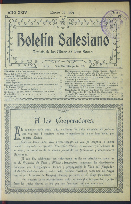 Boletín Salesiano. Enero 1909