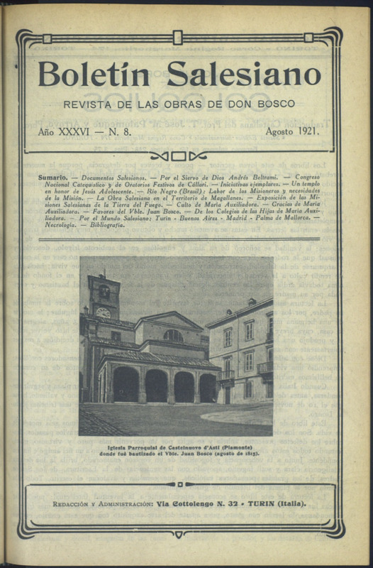 Boletín Salesiano. Agosto 1921