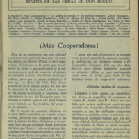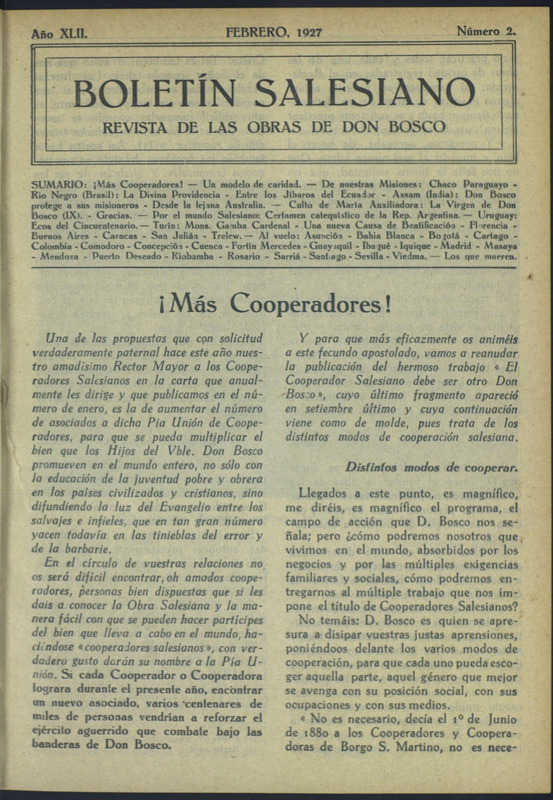 SUMARIO: ¡Más Cooperadores! — Un modelo de caridad. — De nuestras Misiones: Chaco Paraguayo Rio Negro (Brasil): La Divina Providencia - Entre ios Jibaros del Ecuador - Assam (India): Don Bosco