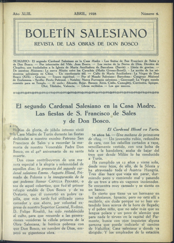 S U M A R IO : £ i segundo Cardenal Salesiano en la C asa Madre > Las fíesfas de San Francisco de Sales y